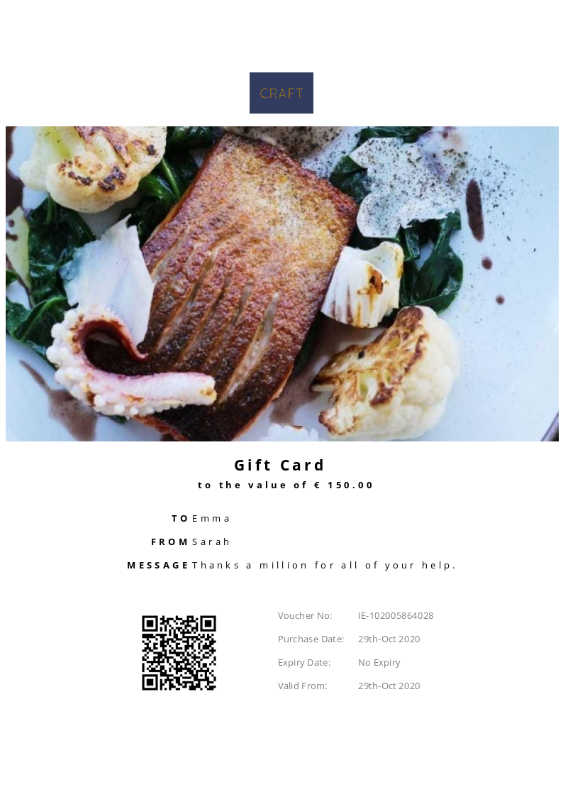 Craft allows you to purchase instantly printable gift vouchers, special offers and tickets using the Voucher Connect platform.